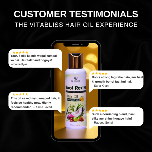 Discover the transformative power of Root Revive Hair Oil, a blend of 7 natural oils: argan, amla, castor, rosemary, almond, coconut, and onion. Perfect for reducing hair fall, promoting growth, and adding shine. Its lightweight, non-greasy formula is safe for all hair types.
